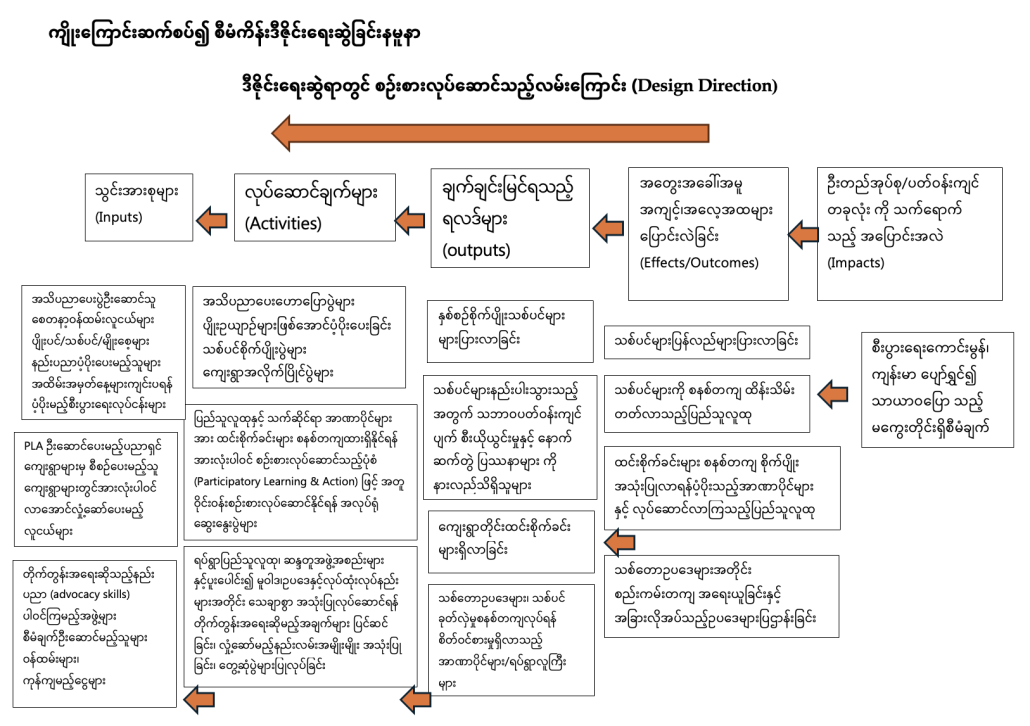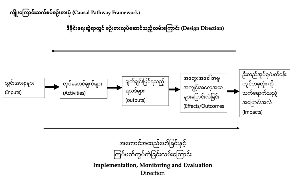 ဆက်လက်၍ ကျိုးကြောင်းဆက်စပ်မှုအဆိုမူကြမ်းကို အခြေခံ၍ ထည့်သွင်းရမည့် အောက်ဖော်ပြပါ ကျိုးကြောင်းဆက်စပ်မှုလမ်းကြောင်းမူဘောင်ကို အနည်းငယ်ဆက်လက်ရှင်းပြပေးပါ။ စီမံချက်ဒီဇိုင်းအတွက် စဉ်းစားရာတွင် ကိုင်တွယ်မည့်ပြဿနာ/ကိစ္စရပ်ကို ဖြေရှင်းလိုက်သည့်အတွက် ရလိုသည့်လူမှုဘဝအပြောင်းအလဲများ၊ အခြေအနေများကို စတင်စဉ်းစားရပါသည်။ ဥပမာ – သစ်ပင်ချစ်သူများအဖွဲ့အနေဖြင့် သစ်ပင်စိုက်ရန် လှုံ့ဆော်ရသည့်အဓိကရည်ရွယ်ချက်မှာ သဘာဝပတ်ဝန်းကျင်အခြေအနေများ ပြန်လည်ကောင်းမွန်၍ စားဝတ်နေရေးအဆင်ပြေသည့်အခြေအနေတခု၊ စီးပွားရေးကောင်းမွန်ပြီး ကျန်းမာပျော်ရွှင်သည့်လူ့ဘောင်အသိုင်းအဝိုင်းတခုကို ရရှိလိုသည့်အိပ်မက်ဖြင့်ဖြစ်သည်။ စီမံချက်ဒီဇိုင်းတခုရေးဆွဲလျှင် နောက်ဆုံးရလိုသည့် ပန်းတိုင်မှ စပြီး ဒီလိုဖြစ်ဖို့ ဘာတွေပြောင်းဖို့လိုသလဲ။ အဲလိုပြောင်းဖို့ဘာတွေရှိထားရမလဲဆိုသည်ကို တဆင့်ချင်းစဉ်းစားတွေးတောယူကြရသည်။ အောက်ဖော်ပြပါ မူဘောင်တွင် ဒီဇိုင်းရေးဆွဲသည့်လမ်းကြောင်းကိုပြသည့် မြားသည် နောက်ဆုံးရလိုသည့်ရလဒ်မှ တဖြည်းဖြည်းပြန်စဉ်းစားယူသည့်နည်းလမ်းဖြစ်သည်။ လုပ်ငန်းအကောင်အထည်ဖော်ခြင်းနှင့် ကြပ်မတ်ကွပ်ကဲခြင်းတို့တွင်မူ သွင်းအားစုများကို ပြင်ဆင်ပြီး လုပ်ငန်းများလုပ်မှသာ ရလဒ်များကို တခုချင်းရနိုင်မည်ဖြစ်သည်။