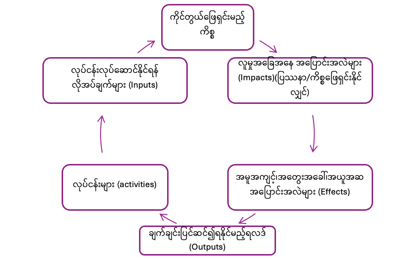 ၄) ကြပ်မတ်စစ်ဆေးခြင်းနှင့် အရည်အသွေးထိန်းချုပ်ခြင်း (Monitoring and Quality Control): တိုးတက်မှုအခြေအနေများကို ငွေကြေးဆိုင်ရာ ရှုထောင့်မှသာမက လူမှုဆိုင်ရာ ညွှန်းကိန်းများ (Social Indicators) ဖြင့်ပါ အကဲဖြတ်ပြီး၊ အကျိုးသက်ရောက်မှု အများဆုံးရရှိစေရန် လိုအပ်သလို ပြုပြင်ပြောင်းလဲလုပ်ဆောင်ကြရသည်။