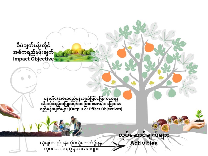 ဤအရင်းအမြစ်များ/သွင်းအားစုများ(INPUTS)နှင့်လုပ်ငန်းဆောင်ရွက်ချက်များ (ACTIVITIES) က ဤထုတ်ကုန်များနှင့် ဝန်ဆောင်မှုများ(OUTPUTS) ကို ရရှိစေမည်။ ယင်းတို့က လူများ၏အပြုအမူများတွင် အပြောင်းအလဲများ(EFFECTS)ကိုဖြစ်ထွန်းစေပြီး ယင်းတို့က လိုလားသည့်အကျိုးရလဒ်အပြောင်းအလဲများ(IMPACT)အတွက်အထောက်အကူဖြစ်စေနိုင်မည်။